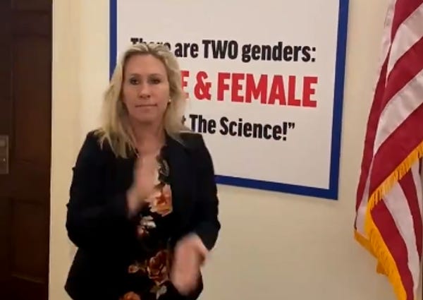 And Greene responded by sticking up a poster proclaiming "There are TWO genders: MALE & FEMALE 'Trust The Science!'" Because apparently Rep. Greene's God wants her to make sure Rep. Newman can't bring her daughter to work without subjecting her to harassment by a grown adult politician.