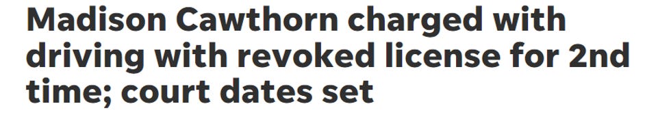 Cawthorn, a sitting Republican congressman (for however much longer that lasts), has been "charged with driving with a revoked license, a misdemeanor that carries up to 20 days in jail." As that headline above suggests, this is the second time he has been charged with this. The last one was in 2017, but the paper says it was dismissed.