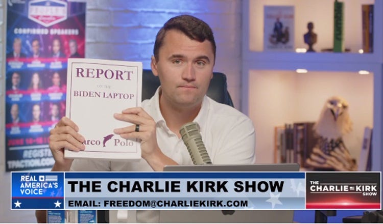 Rightwing media person Charlie Kirk, his head still far too large for his face, insisted that not only was Hunter’s case a distraction from his father’s far worse crimes, it also proves just how ruthless a mob boss Joe Biden is (when he’s not too feeble to say what day it is):