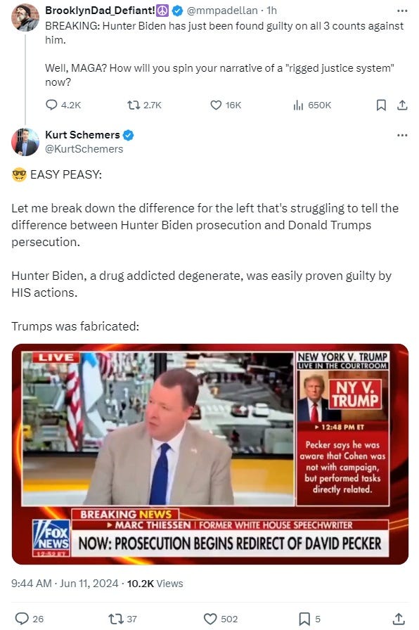 Probably the worst reaction from Biden supporters was the naive and entirely too common belief that maybe Hunter Biden’s conviction would demonstrate to Trump supporters that no, the justice system isn’t rigged against Donald Trump, or even that it might suggest to them that Joe Biden doesn’t personally determine the outcome of court cases. Here’s a pretty typical example of the genre, from a 1.3 million-subscriber account I’ve never heard of, followed by a very Trumpian reply:
