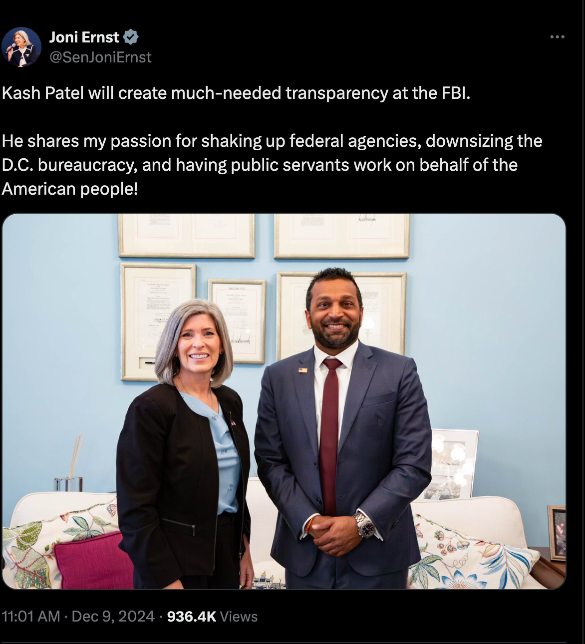 Yeah, Joni Ernst is not a serious human being or a good human being who loves this country, and that right there picture with Kash Patel is all the evidence you need.