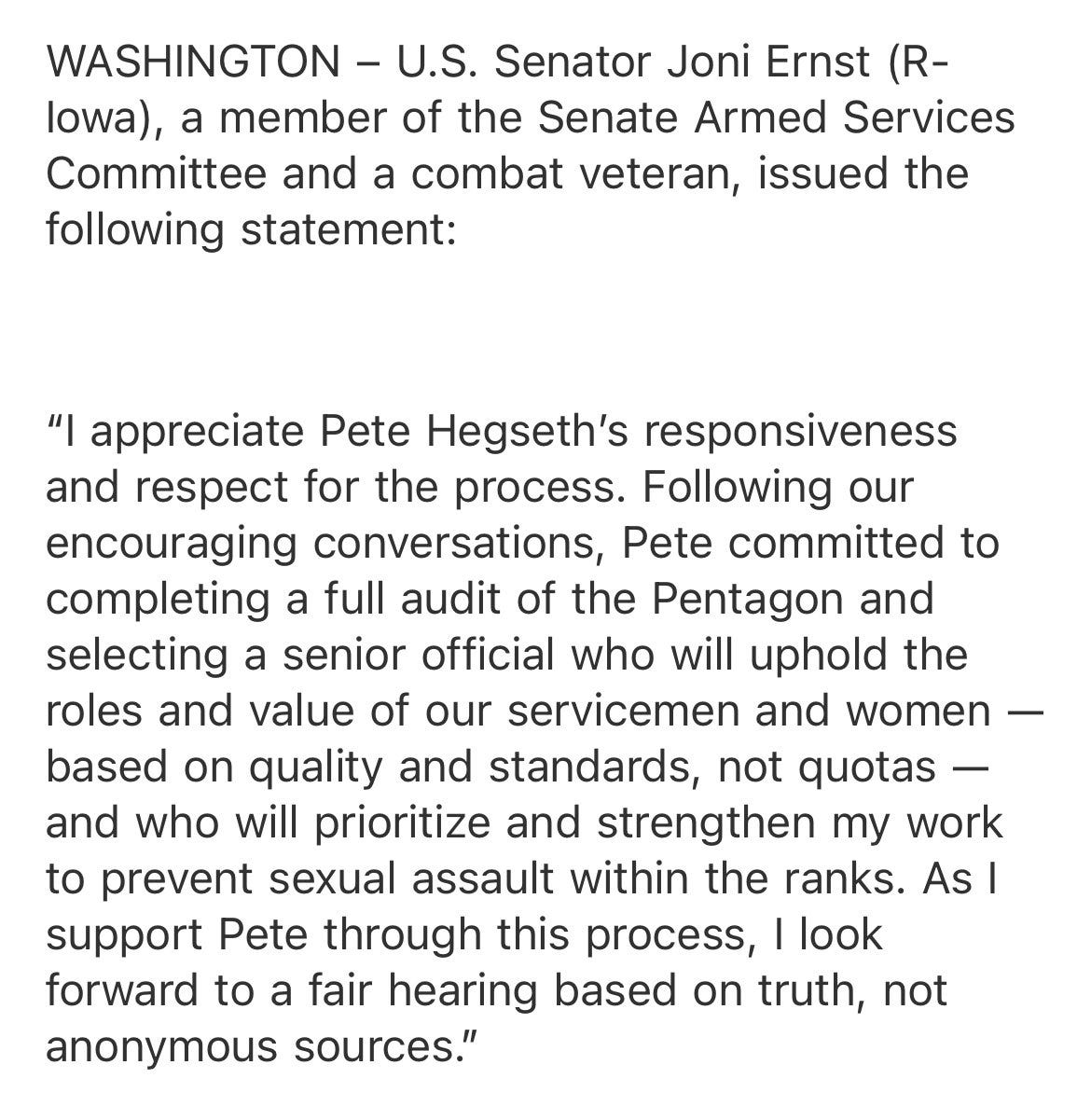 “I appreciate Pete Hegseth’s responsiveness and respect for the process. Following our encouraging conversations, Pete committed to completing a full audit of the Pentagon and selecting a senior official who will uphold the roles and value of our servicemen and women”