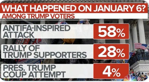 This is exactly what happened during President Klan Robe's reign. White supremacists became more emboldened and some even echoed his rhetoric. The one-term loser feigned zero awareness of the Proud Boys or other extremist groups while declaring without evidence that the greatest threats were all from the left. White domestic terrorists later attacked the Capitol on the mad king's behalf and his supporters still insist that it was all antifa. New York University professor Jay Rosen tweeted a screenshot from "Meet the Press" showing the results of Suffolk University/USA Today survey of MAGA voters who exist in their own alternate reality.