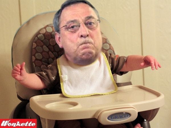 Maine Gov. Paul LePage, not a man given to patience, reason, or indeed any known habits of civilized humans, abruptly stormed out of a dedication ceremony at the University of Maine at Farmington Tuesday after noticing two (2) students holding signs protesting his presence. He stammered out a few disjointed words, muttered "I'm done," then stomped off the outdoor stage as fast as his little feet could take him.