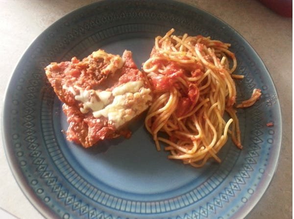 Have some more wine, make spaghetti. When the spaghetti is done, check on your eggplant to see if the cheese is all melted, which it probably should be, so take it out or leave it in for a few minutes if it's not. Wash off your spaghetti, put it in a bowl with the rest of your gravy and serve. Oh, also probably put the sausage on a different plate or save for sandwiches.