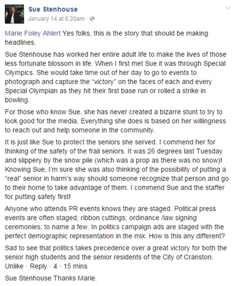 We really love that bit about Stenhouse "protecting" seniors by not subjecting a real old lady to the cold during her press event. What's more, by dressing a bus driver in drag, she may even have saved some defenseless elderly person from being taken advantage of! Besides, politics is all about fakery. Why are you people making such a big deal out of this? There is no truth to the rumor we just made up that Stenhouse is seeking a PR job with the Trump campaign, although now you can say you read it on the internet.
