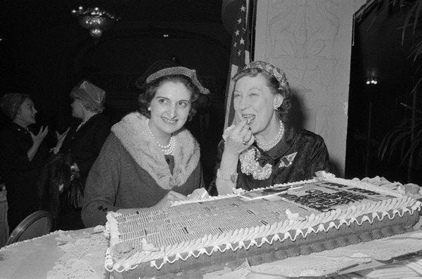 Here is your bit of "DC gossip" for the day: a Jell-o dessert recipe, for the holiday of Thanksgiving! It is Mamie Eisenhower's famed Red Scare Thanksgiving Jell-o Dessert and it is best served chilled, to family members you hate. (There is Mamie right there up top with "friend" Lenora Hickock, feeding each other Jell-O and giggling knowingly.) This vile thing is exactly what the Eisenhowers used to force-feed the Soviets, and it is delicious .
