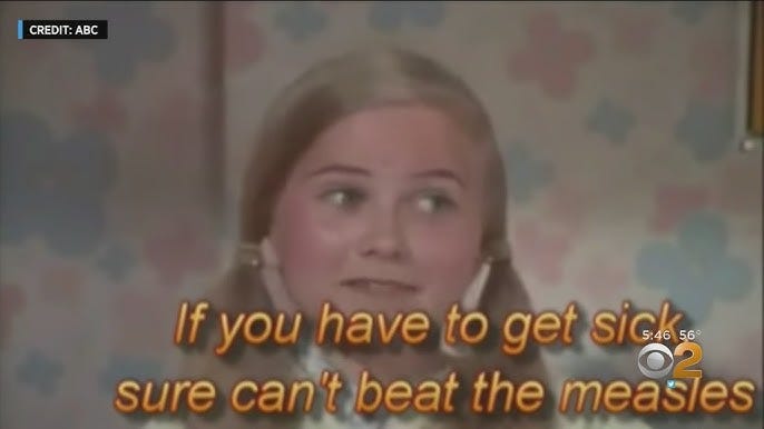 An episode of “The Brady Bunch” in which all the kids get the measles, which is no big deal at all, they get to stay home from school, and Marcia Brady says, famously, “If you have to get sick, you can’t beat the measles.”
