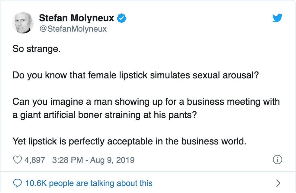 Stefan Basil Molyneux is a far-right, white nationalist Canadian podcaster and YouTuber who is known for his promotion of scientific racism and white supremacist views. Molyneux is described as a leading figure of the alt-right movement by Politico and The Washington Post, and as a far-right activist.