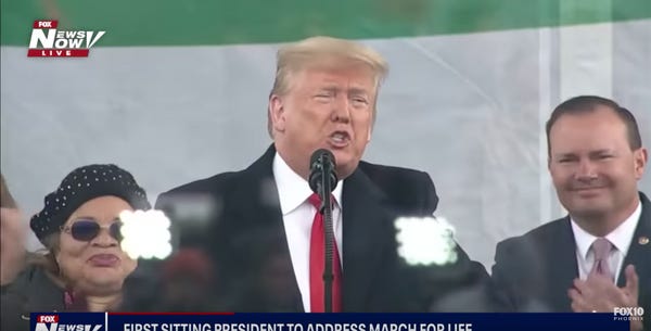 Yesterday, Donald Trump became the first US president to attend the March For Fetuses Who Can Go Fuck Themselves The Moment They Leave The Womb. He even gave a little speech. You know, because he very sincerely gives many fucks about abortion and is definitely not just groveling before the religious Right in hopes of keeping their approval, as if any of them even believe, as their signs say, that he is "the most pro-life president ever." We know and they know that he has probably paid for at least a few abortions in his time, and that he's almost certainly never cracked open a Bible.