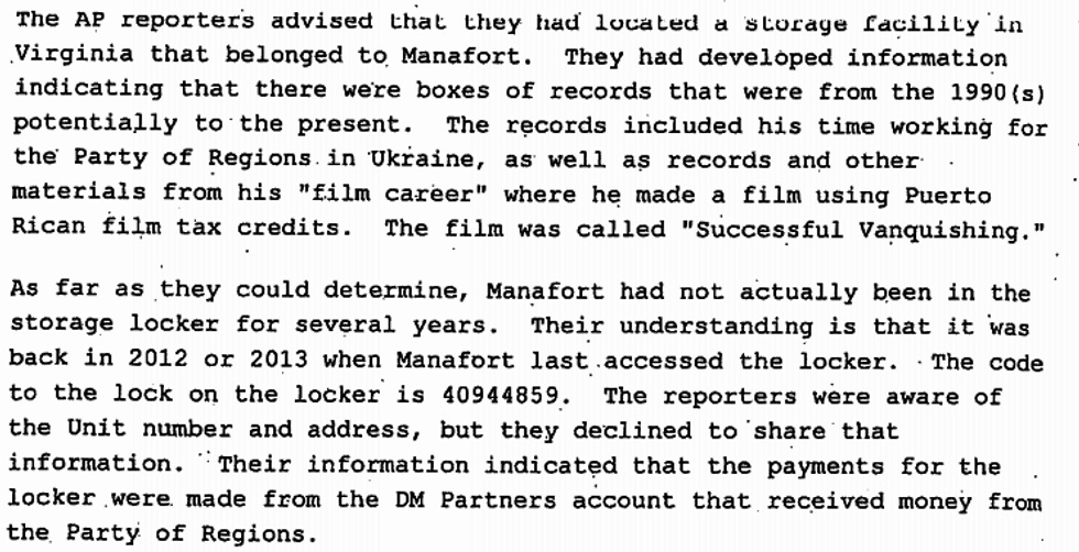 So Manafort's lawyers can GTFOH pretending that the Mueller team leaked to reporters! The AP tipped the FBI to the existence of the storage locker (including the combination), information on a likely Manafort/Deripaska scam involving a Ukrainian cable company, dates and amounts of possible transfers of laundered money, and the identity of a shell company Manafort may have used to get money into the US.
