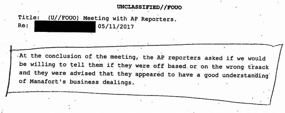 At the conclusion of the meeting, the AP reporters asked if we would be willing to tell them if they were off based or on the wrong track and they were advised that they appeared to have a good understanding of Manafort's business dealings.