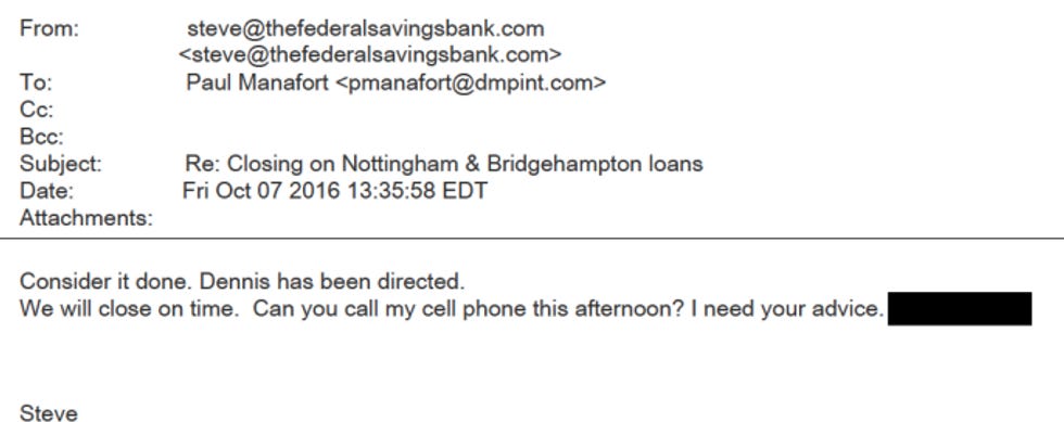 Here's an email chain from October, where Manafort cops to having had a "blackout" and botching the numbers on his loan application, but, "I look to your cleverness on how to manage the underwriting." Luckily, his good buddy Steve Calk will make it happen anyway!
