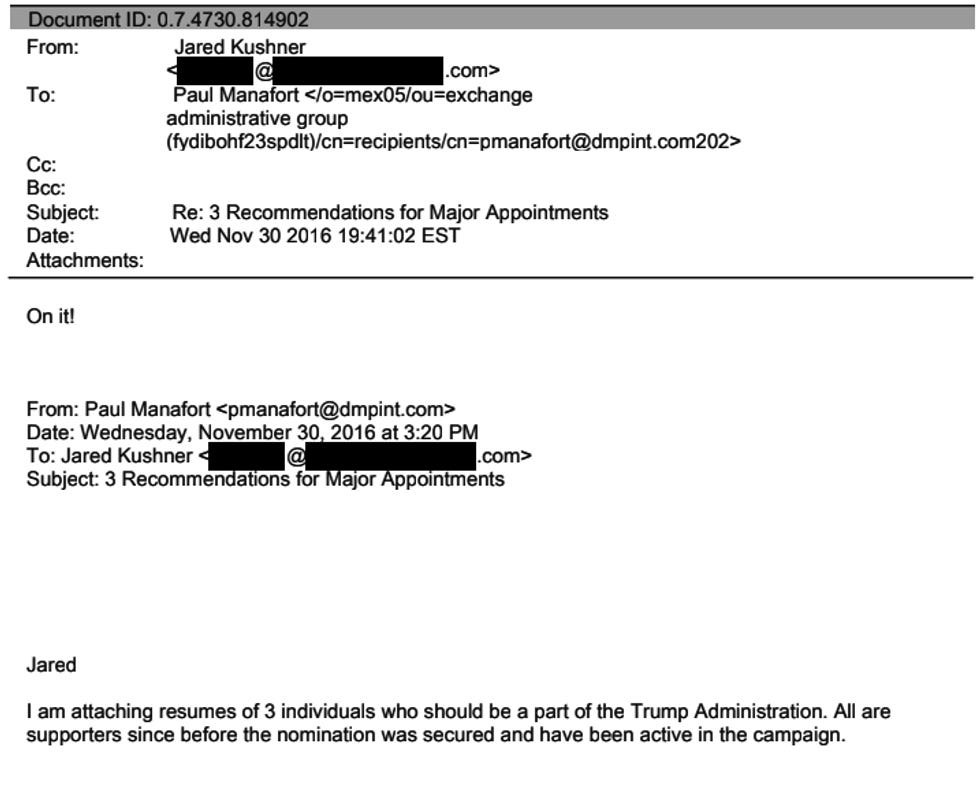 And here's Manafort passing along the marching orders to Jared Kushner, who says, "If it's what you say I love it especially later in the summer." Well, more or less.