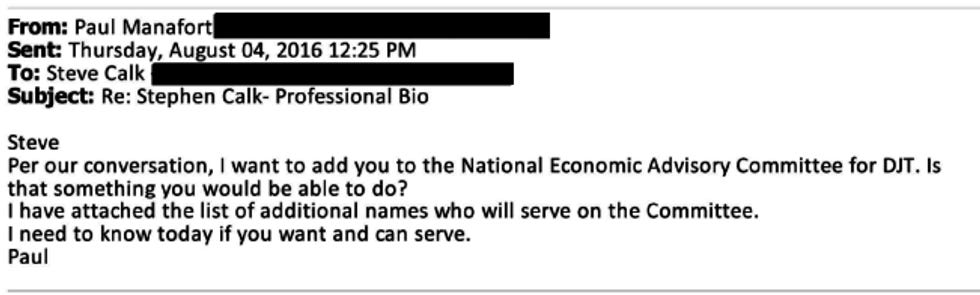 Here's Manafort getting Calk a position on Trump's Economic Advisory Committee in August, just as Calk's bank began evaluating Manafort's creditworthiness.