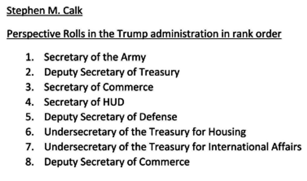 Here's Calk putting in an order for a plum job in Trumpland after November's election, including a list of "Perspective Rolls in the Trump administration in rank order." SERIOUSLY. SIC. SIC TRANSIT GLORIA MUNDI .
