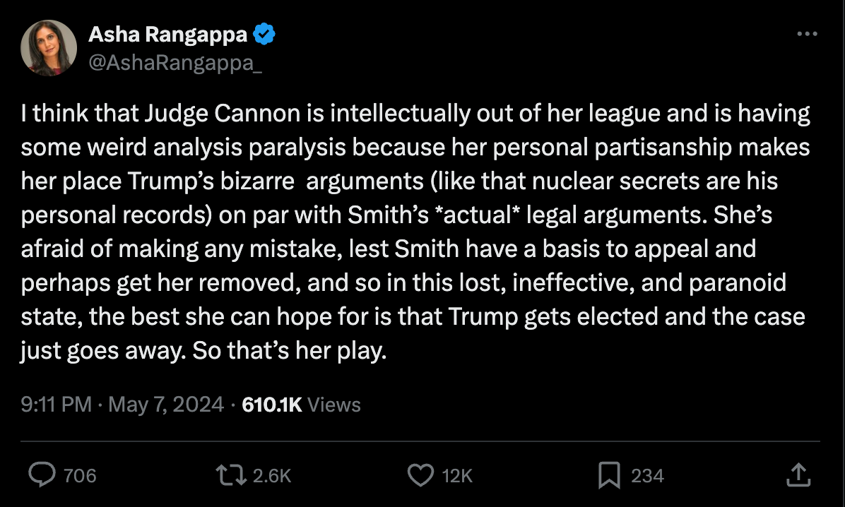 “I think that Judge Cannon is intellectually out of her league and is having some weird analysis paralysis because her personal partisanship makes her place Trump’s bizarre arguments (like that nuclear secrets are his personal records) on par with Smith’s *actual* legal arguments. She’s afraid of making any mistake, lest Smith have a basis to appeal and perhaps get her removed, and so in this lost, ineffective, and paranoid state, the best she can hope for is that Trump gets elected and the case just goes away. So that’s her play.”