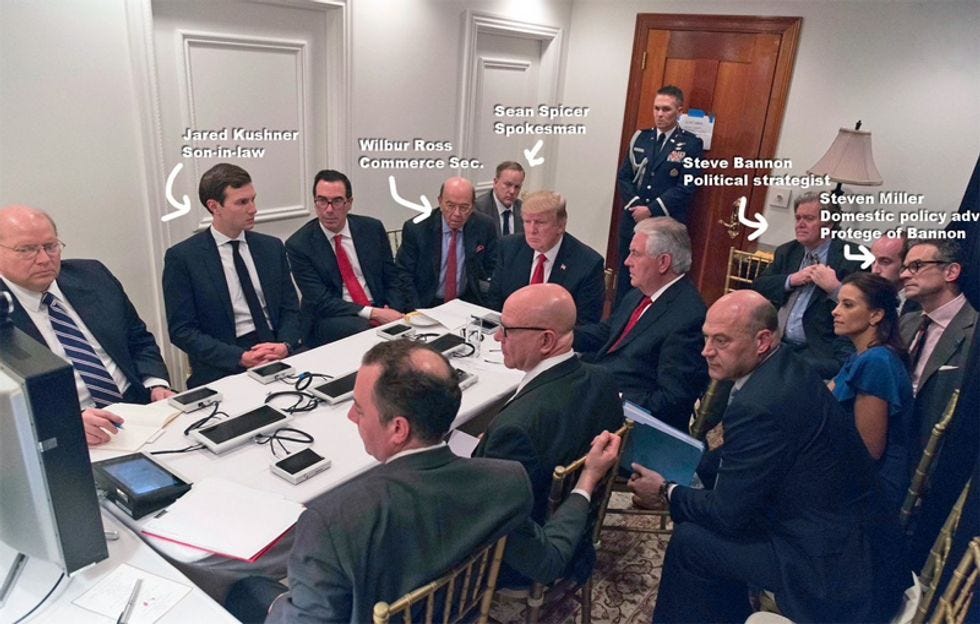 At least now we have a partial explanation of that bizarre photo the administration released the next day, showing Trump and whoever happened to be at Mar-a-Lago the night of the attack. It was a strange parody of the famous Obama Situation Room photo the night of the bin Laden raid, except with a lot of people in it who have nothing to do with national security, like SILOTUS Jared Kushner and Commerce Secretary Wilbur Ross:
