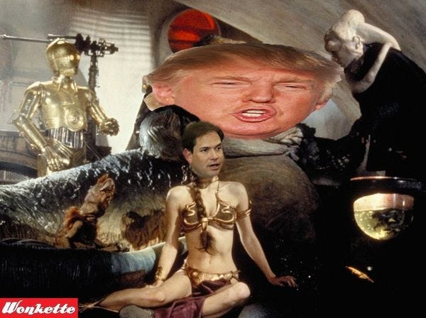 Jabba the Trump laughed, that peculiar laugh that always sounded strangely like "YOOGE ... YOOGE ... YOOGE." Then he spoke: "BUT WHY WOULD I DO THAT, WHEN THE REPUBLICAN NOMINATION -- " he hefted his enormous bulk to gesture to the figure of Captain Reince Priebus, frozen in carbonite, " -- OCCUPIES SUCH A LOVELY PLACE ON MY CLASSY PALACE WALL?"