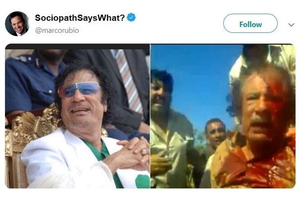 @marcorubio Just a US Senator tweeting out stills from a snuff film. Nothing creepy about that at all.