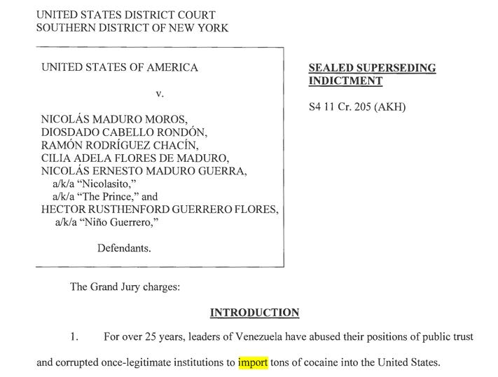 But, speaking of the court orders that Rubio is citing as justification, let’s take a look at what the unsealed four-count indictment against Maduro says.