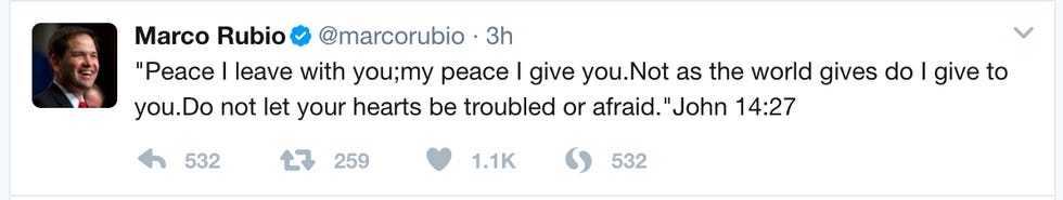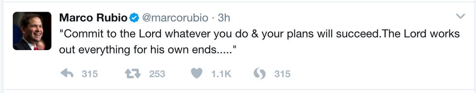 There are things in your life that you spend years learning at school and you think they will never come in handy, like various maths or how to diagram a sentence or the entire New Testament. But now, I am pleased to report, that knowledge of Scripture is paying itself back manyfold because Marco Rubio is tweeting Bible verses and now I'm totally cool on this Trump thing!