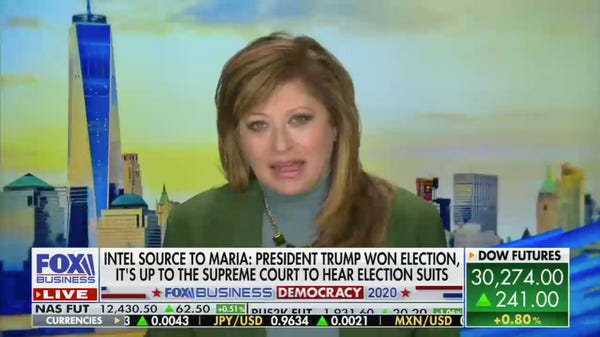 "Challenging election results, as we await today's Electoral College decision, an intel source telling me that President Trump did in fact win the election," Bartiromo said this morning, to begin a discussion block on her Fox Business show.[...]
