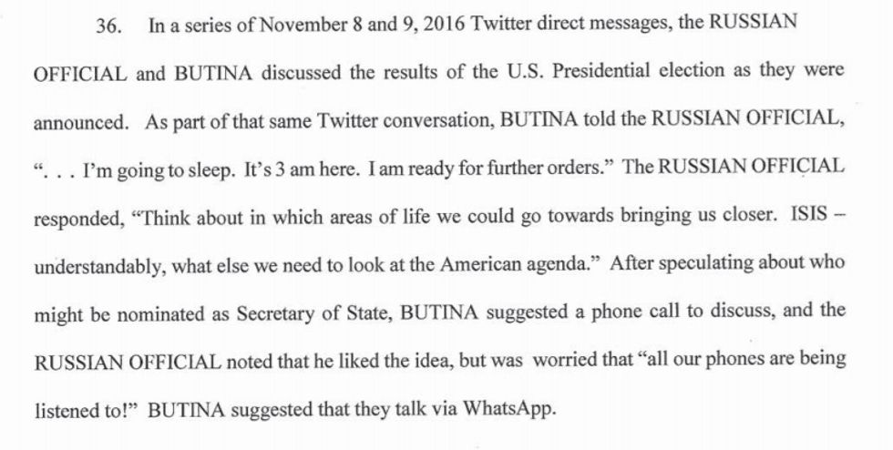 The night of the election, Butina asked Torshin for FURTHER ORDERS, but noted that she was going to go nighty night first: