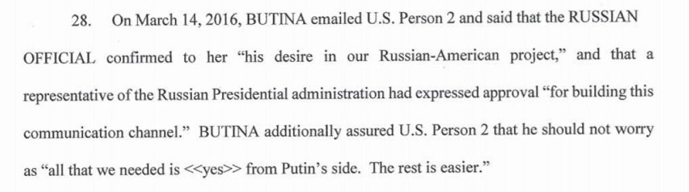 It appears that by March of 2016, Butina's work had the explicit blessing of Torshin and the Putin government, for her spying and her back channels and her "Borscht 'n' Blab" dinners with the GOP: