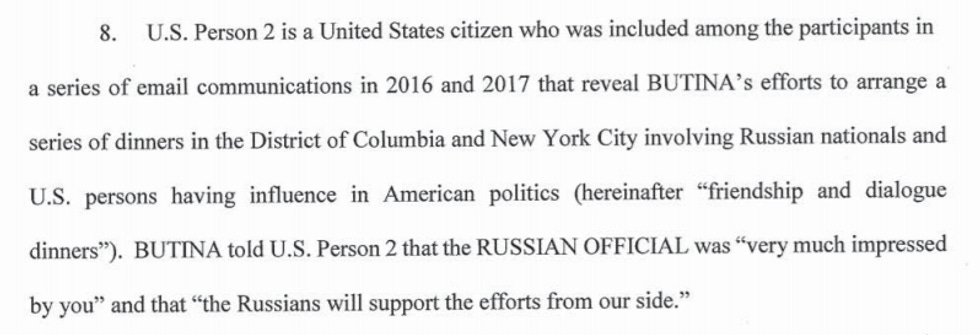As we noted above, the complaint alleges that Butina's direct handler in the conspiracy was her boss, Aleksandr Torshin, whom it describes as "RUSSIAN OFFICIAL." We should also note that there is a person in the indictment referred to as "U.S. Person 1," who allegedly helped Butina with her shady-ass spy work. The Washington Post reports that the complaint's description of that person "matches that of Paul Erickson, a GOP consultant who sought to organize a meeting between then-candidate Donald Trump and Alexander Torshin, Butina's Russian colleague and a former Russian senator, at a May 2016 NRA convention." Here's another factoid about Erickson: