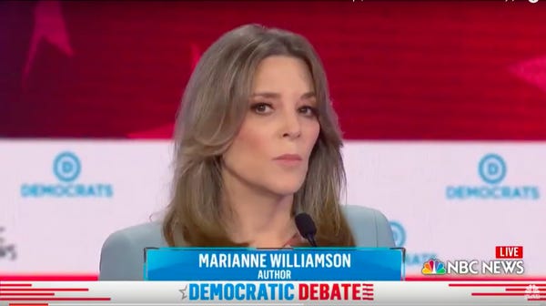 No serious person missed crystal-waving kook Marianne Williamson at Tuesday's Democratic primary debate. We're trying to pick a presidential nominee here and don't have time for Williamson's woo-woo. But Oprah Winfrey's spiritual adviser is real mad that no one seems to think Oprah's spiritual adviser should have command of our nuclear arsenal.