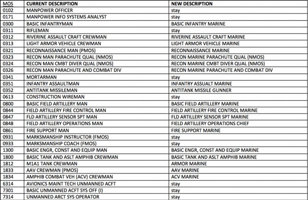 The change affects all of 19 job titles, 15 of which just swap in "Marine" for a term including "man." Some of the others: