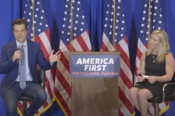 Two of our favorite congress members, Matt Gaetz and Marjorie Taylor Greene have been traversing the country with their little "America First" rallies, at which they promote the narrative that the election was stolen from Donald Trump (by who, specifically, they cannot say), downplaying the events of January 6 and spreading other ridiculous conspiracy theories.