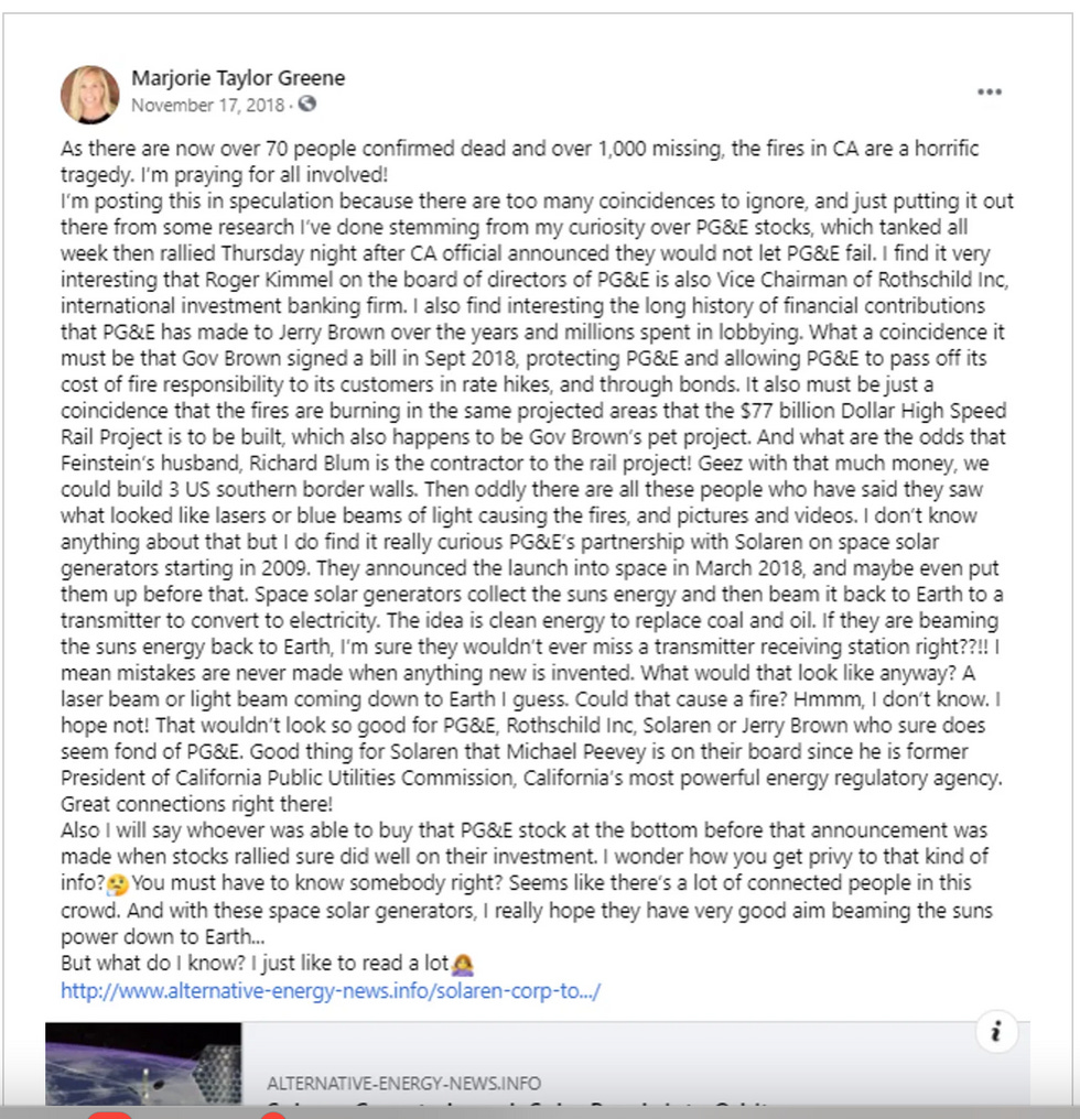 Back in 2018, Greene posted a Tolstoy-length diatribe on Facebooksuggesting that the latest California wildfires weren't the obvious result of climate change but in fact part of a larger globalist conspiracy involving lasers from outer space ... "space lasers," if you will.