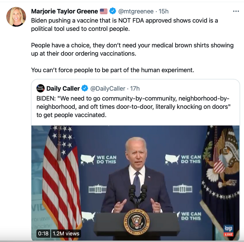 Greene's freakout was in response to a video of Biden saying, "We need to go community-by-community, neighborhood-by-neighborhood, and oft times door-to-door, literally knocking on doors to get help to the remaining people protected from the virus."