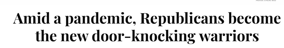 This is not a forced vaccination program. No serious person would believe that, but Rep. Dan Crenshaw, who once criticized Greene's antics, insisted that politicians shouldn't come to people's doors advocating for a specific position. It's as if he doesn't understand how politics worked before Twitter or Fox News. Republicans canvassed door to door last year, during the height of the pandemic, without regard to COVID-19 restrictions, which arguably helped them flip seats because Democrats cared about people's health.