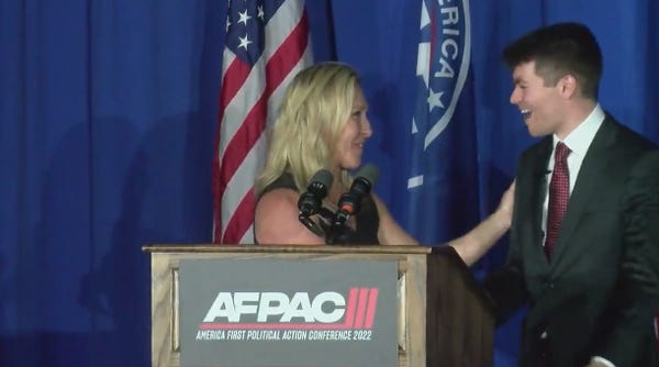 But anyway, back to that huggy video! It's Greene in February at Fuentes's America First Political Action Conference, which we thiiiiink is for people who think CPAC is full of liberals. Again, this was February, of this year.