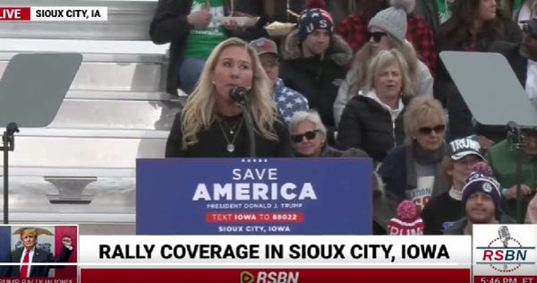 Good morning, let's check in with one of America's most garbage humans and the even smellier people who cheer when she talks. We are of course talking about Marjorie Taylor Greene and the people who enjoyed hearing her speak at the Trump rally yesterday in Sioux City, Iowa.