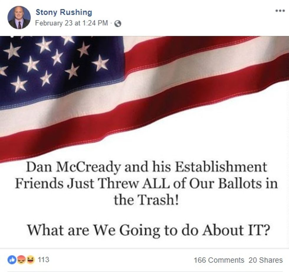 Rushing isn't particularly worried a Republican could be hurt by the recent fuss over a little bit of ballot frauding in the 2018 race, either, because he says the scandal was "blown out of proportion." In fact, once the Elections Board moved to hold a new election, Rushing took to Facebook to say who was at fault: not Mark Harris for hiring a fraudy grifter, or the fraudy grifter who submitted faked absentee ballots (and presumably disappeared some real ones), but obviously, Democratic candidate Dan McCready and all the Republicans who do his bidding, because that's just how they are.