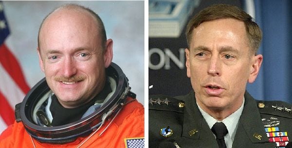 Here's a story we were meaning to get to, and then a whole bunch of other stuff happened. Last Friday, retired Army general and former CIA director David Petraeus and Mark Kelly, the retired NASA astronaut and husband of former congresswoman Gabrielle Giffords, announced they were forming a new gun safety organization to be called the Veterans Coalition for Common Sense. The group will invite veterans of all branches of the armed forces to urge lawmakers at the state and federal levels to toughen gun laws. For some reason, coverage of the new group has been overshadowed by other events.