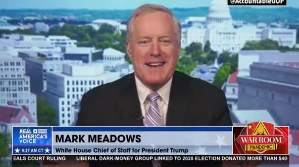 Mark Meadows, the guy who quit a perfectly good seat in Congress so he could go suck Donald Trump's teat as his chief of staff, told Steve Bannon this week about a fever dream he's been having lately.
