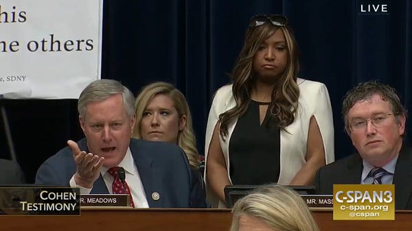 Yr. SER shook his head when Cummings defended Meadows when he was accused of racism. Meadows was just your average non-racist guy who likes to have black women stand behind him during congressional hearings as emotional support sisters. Meadows angrily shut down Tlaib by listing all the black people he knew personally and boasting of his close friendship with Cummings. We knew that Meadows was just using Cummings as his own Defense Exhibit A. God forbid Meadows actually listen to a woman who didn't agree with him. He might've learned something.