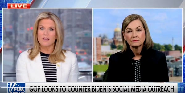 “Asked by Fox News what the GOP can do to "up the game" and compete with Democrats' messaging on social media, Iowa Gov. Kim Reynolds says "Big Tech and social media is having a horrible impact on this country" while proposing to "go after them and hold them accountable."”