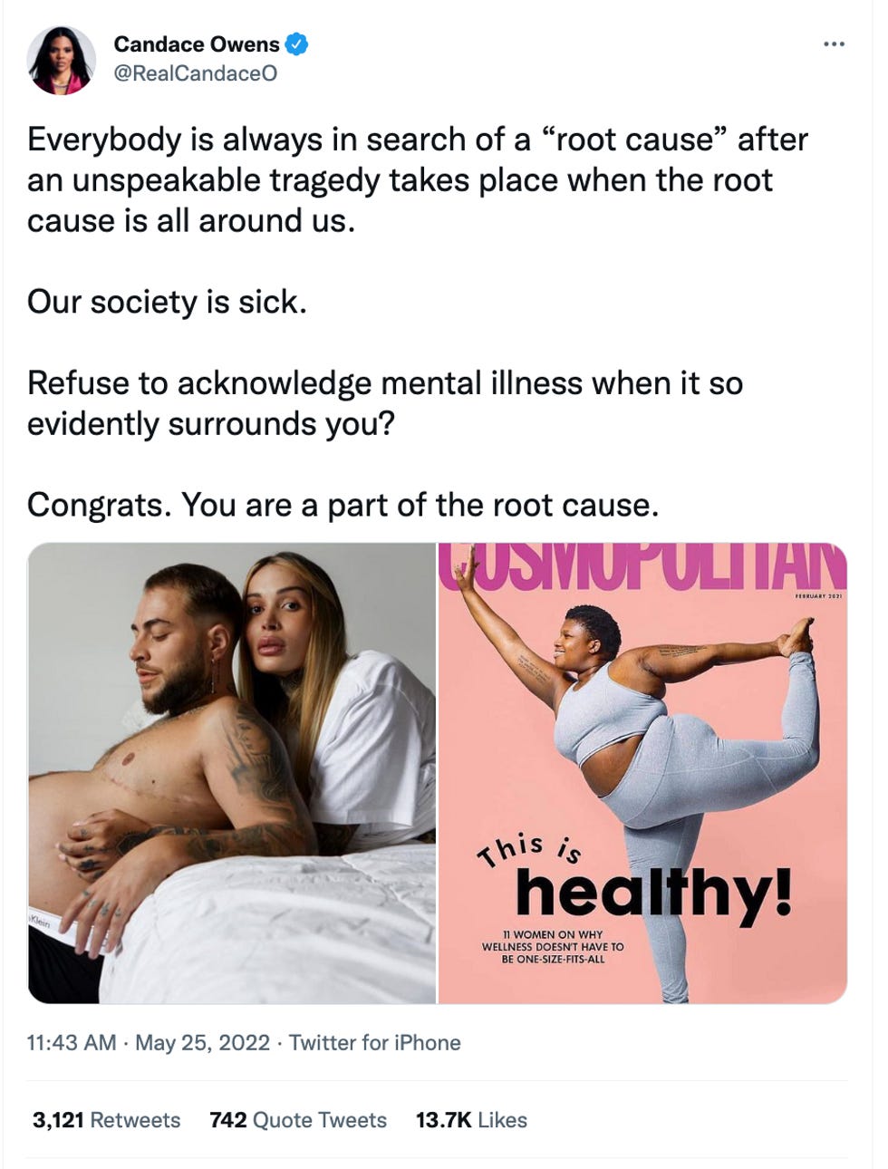 "Everybody is always in search of a 'root cause' after an unspeakable tragedy takes place when the root cause is all around us. Our society is sick." she tweeted, "Refuse to acknowledge mental illness when it so evidently surrounds you? Congrats. You are a part of the root cause."