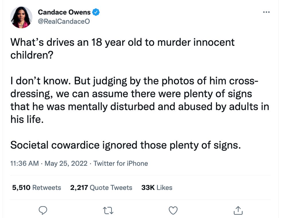 "What’s drives an 18 year old to murder innocent children? I don’t know," Owens tweeted, "But judging by the photos of him cross-dressing, we can assume there were plenty of signs that he was mentally disturbed and abused by adults in his life. Societal cowardice ignored those plenty of signs."