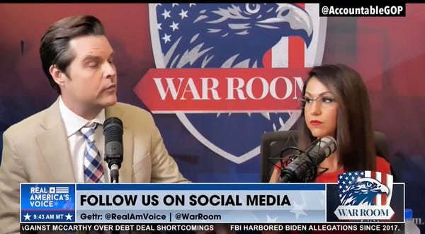The MAGA goons blocked some pointless bills Tuesday that were supposed to protect patriotic gas stoves from the radical Left. That night on Steve Bannon's podcast, Gaetz, with special guest villain Lauren Boebert, said he was going to "force" McCarthy into a "monogamous relationship" with either the Freedom Caucus or House Democrats.