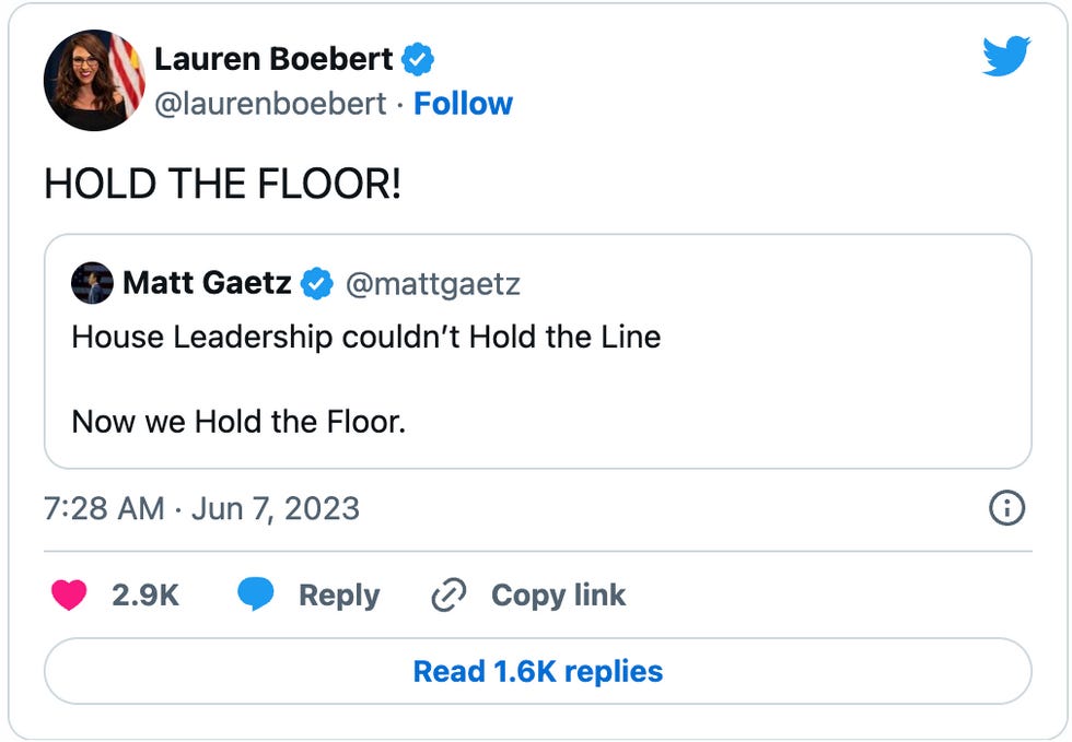 Wednesday, Gaetz tweeted, "House Leadership couldn’t Hold the Line. Now we Hold the Floor," and Boebert responded, "HOLD THE FLOOR" (in all-caps, like an addled grandmother).