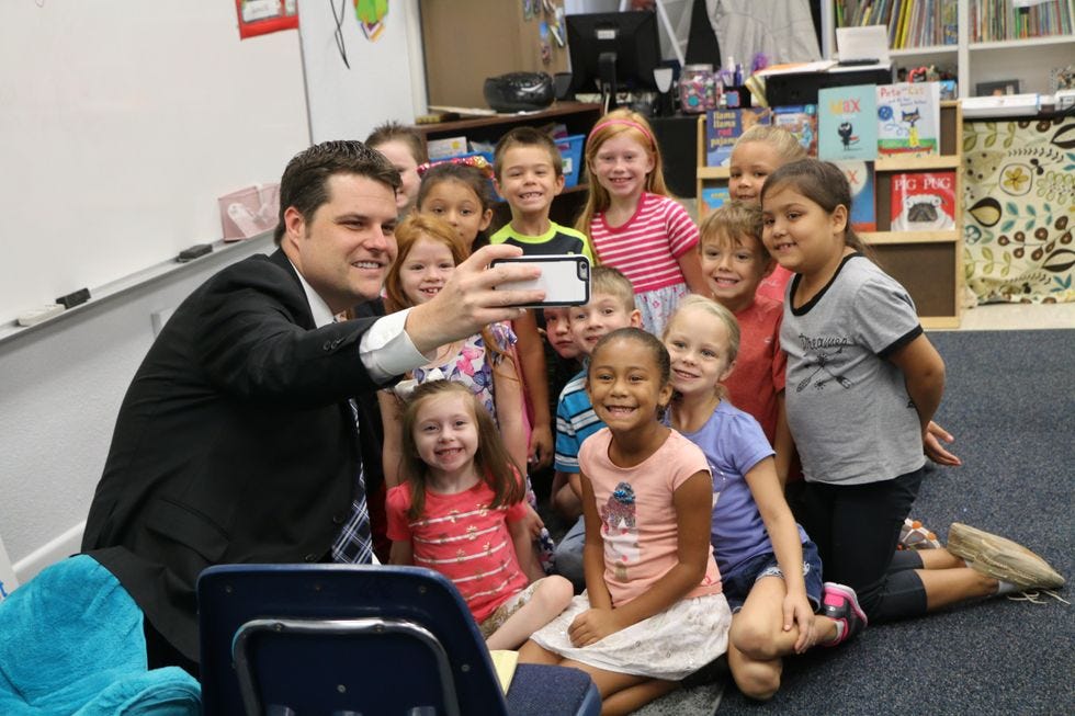 Greenberg then sent the woman a photo of Gaetz taking a selfie with students at Pea Ridge Elementary from a 2017 visit, and wrote, "My friend," indicating that Gaetz would be the friend joining him.