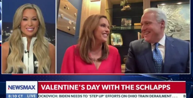 Anyway, he denied it, and then he and his Christian wife Mercedes “Mercy” Schlapp, who worked for the bigoted fascist Trump White House, did a special Valentine’s Day appearance on Newsmax to explain how they keep their marriage SCHLPICY after all these years — mmhmm you betcha — and then the news kinda seemed to fade into the background.