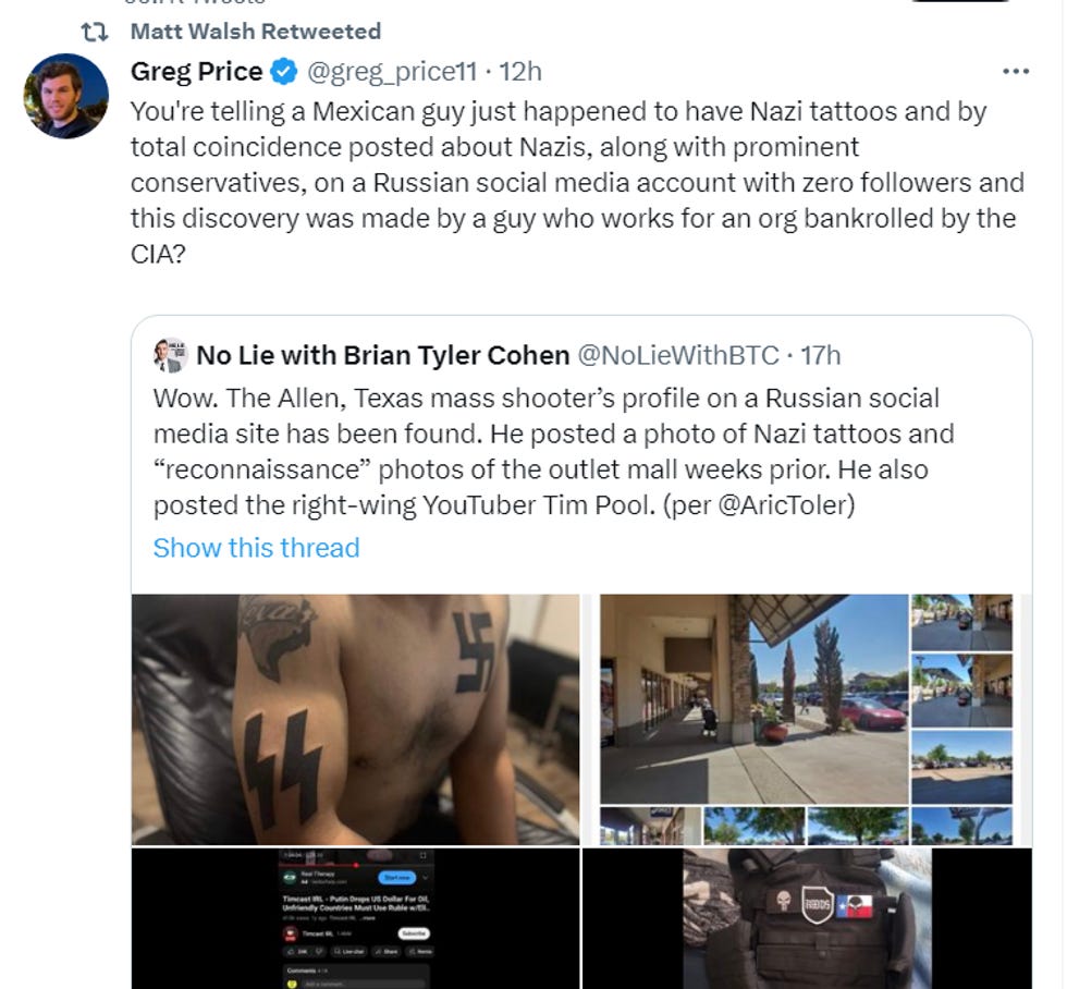 Then there's this Walsh retweet of a guy named Greg Price, which says, "You're telling [ sic ] a Mexican guy just happened to have Nazi tattoos and by total coincidence posted about Nazis, along with prominent conservatives, on a Russian social media account with zero followers and this discovery was made by a guy who works for an org bankrolled by the CIA?"